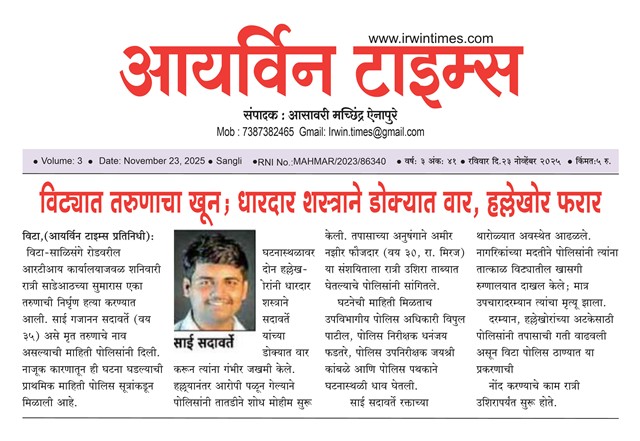 📰 विटा-साळसिंगे रस्त्यावर धारदार शस्त्राने एका तरुणाचा निर्घृण खून. साई सदावर्ते मृत. एक संशयित ताब्यात; इतरांचा शोध सुरू. पोलिस तपास वेगात.